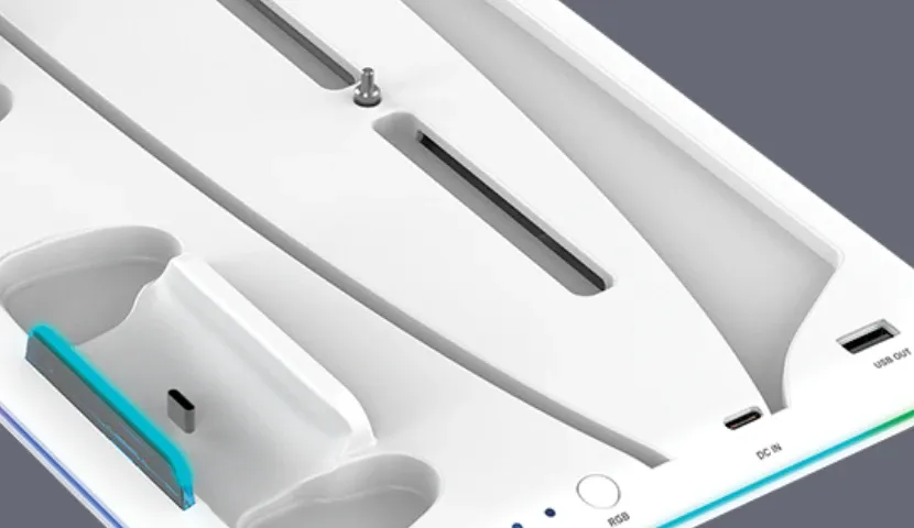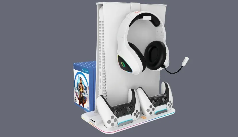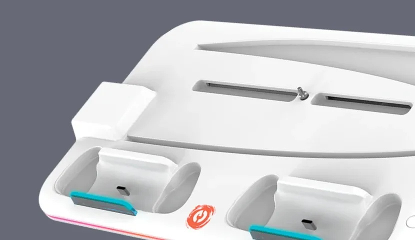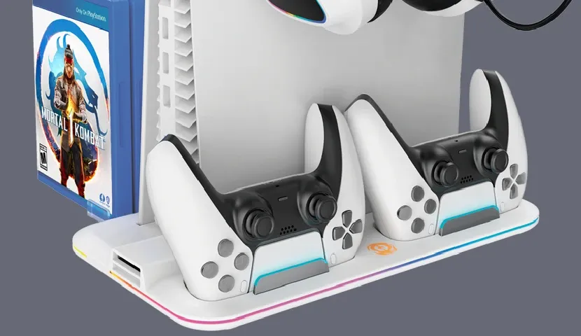 Предусмотрены два слота для зарядки контроллеров PlayStation 5 с индикатором зарядки. Красный свет во время зарядки, а синий после полной зарядки и других режимов.